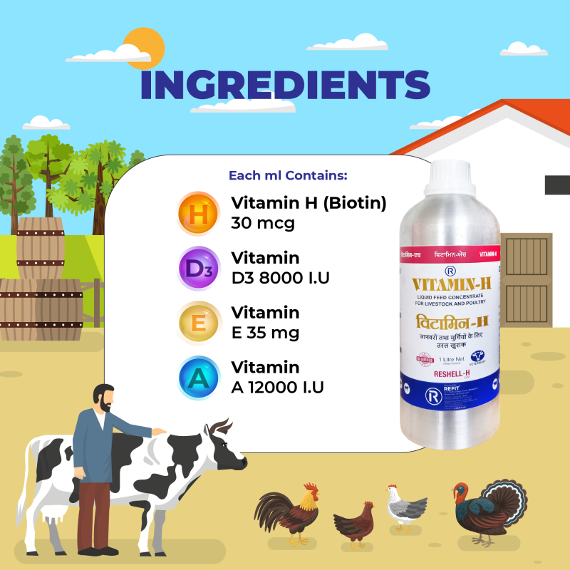 itamin H Supplement for Cow, Cattle, Buffalo, Goat, Chicks, Chicken, Poultry and Livestock Animals, 1 LTR, Pack of 4, Reshell H Lite